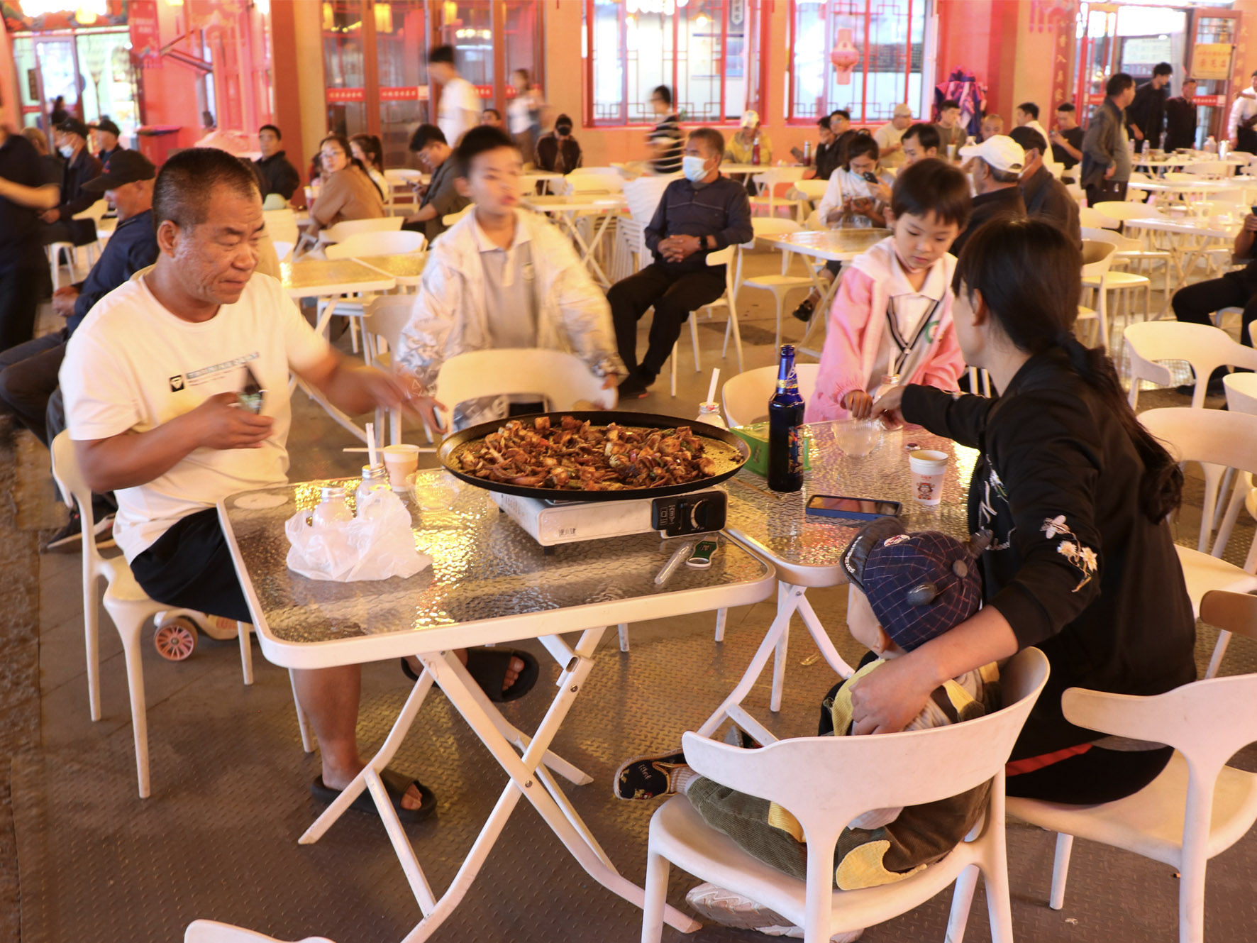 乘著傍晚的夜色,我們一行人來到了當(dāng)?shù)匚幕吐糜紊虡I(yè)街焉支巷子,在這里,炒撥拉是男女老少都喜愛的一道美食,且分量足、價格公道,廣受好評。