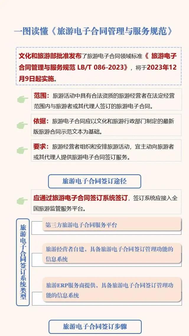 日前,文化和旅游部批準發(fā)布了旅游電子合同領域的行業(yè)標準《旅游電子合同管理與服務規(guī)范》(以下簡稱“標準”),將于2023年12月9日起實施。文化和旅游部正式發(fā)布該規(guī)范的解讀。