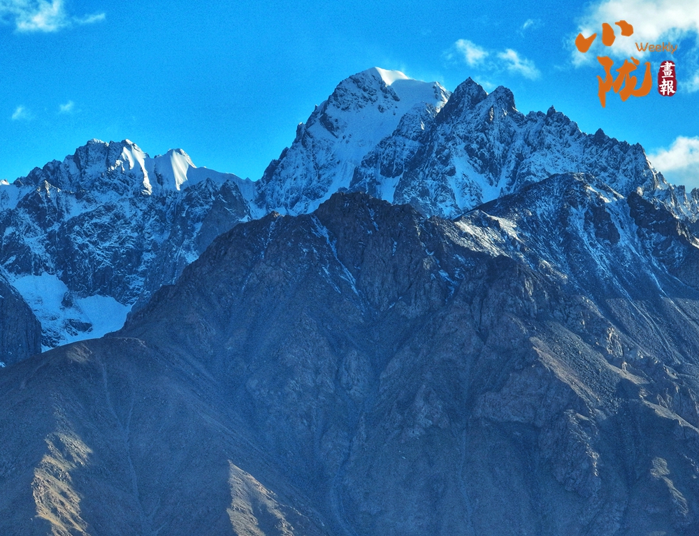 山頂白雪皚皚,熠熠生輝,裸露的山骨終年積雪不化;山下樹綠花開,青山碧水,風(fēng)景如畫。