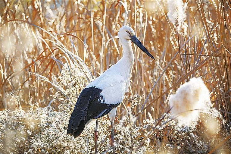 東方白鸛是一種大型涉禽,為鸛形目鸛科鳥(niǎo)類。其體態(tài)優(yōu)美,成鳥(niǎo)體長(zhǎng)超過(guò)1米,黑翅白體,赤腳長(zhǎng)喙,棲息于開(kāi)闊的沼澤、湖泊和潮濕草地。東方白鸛是少見(jiàn)的旅鳥(niǎo),因繁殖分布區(qū)域狹窄,野生種群數(shù)量極為稀少,在《世界自然保護(hù)聯(lián)盟瀕危物種紅色名錄》中屬于瀕危等級(jí),是我國(guó)一級(jí)重點(diǎn)保護(hù)野生動(dòng)物,有“鳥(niǎo)界國(guó)寶”“鳥(niǎo)類大熊貓”之稱。