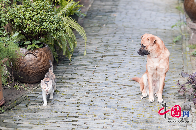 行在青石板路上,總會遇到不同的「原住民」和主人,狹路相逢時,倏地就跑進了自己的地盤。