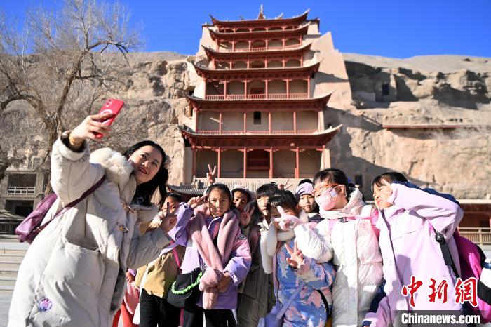 敦煌文化研學(xué)正逐步成為敦煌旅游新時尚,莫高窟成為“研學(xué)養(yǎng)身養(yǎng)心”的學(xué)堂之一。連日來,中新社記者來到冬日的莫高窟,沒有了夏日的人聲鼎沸和如長龍的隊伍,多了更多青春面孔,穿著絢麗服飾、背著書包的學(xué)生,點綴著沉悶的戈壁土黃色。