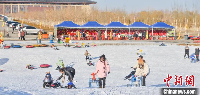1月7日,游人在敦煌文博冰雪場體驗雪地游玩項目。王斌銀 攝
