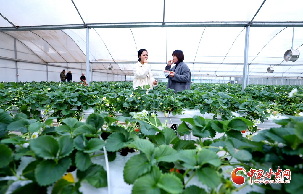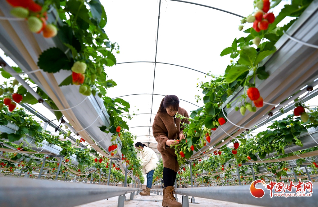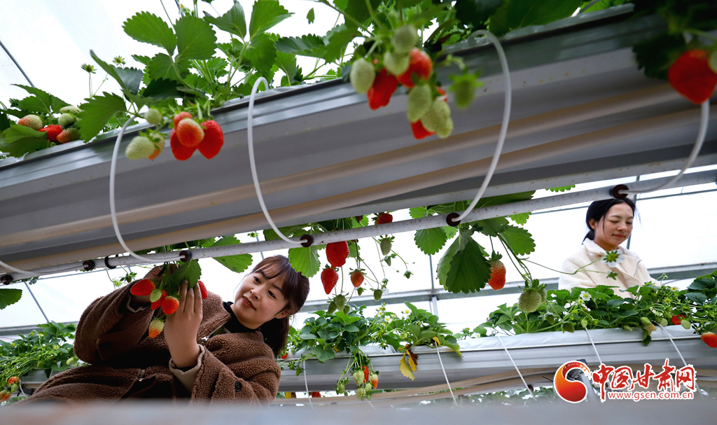 1月15日,甘肅省張掖市甘州區(qū)靖安鄉(xiāng)一草莓種植大棚內,游客正帶著小朋友采摘草莓。