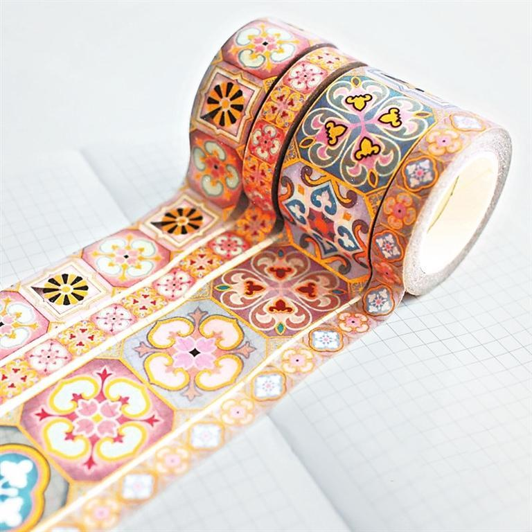 紋樣膠帶——在眾多文創(chuàng)產(chǎn)品中,膠帶的銷售或人氣排行榜靠前。紙膠帶雖是個小物件,但藝術化的紙膠帶卻能夠滿足多種需求,適應多層次人群的需求。圖形多來自器物上的印刻、繪制圖案,或抽象或具體。這也就體現(xiàn)了兩種效果,一種是文藝范,另一種是趣味感,來自重構(gòu)傳統(tǒng)的高大上,消解歷史的審美觀。設計靈感來自中國傳統(tǒng)紋樣,融合敦煌元素,有層次的色彩斑斕,圖案以及細節(jié)都恰到好處。