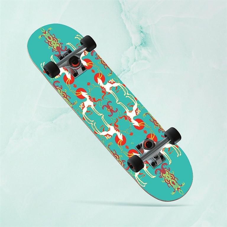 九色鹿滑板——以敦煌壁畫與極限運動相結(jié)合的設計,不僅讓傳統(tǒng)文化玩出了新花樣,同時掀起了一場以敦煌文化為代表的傳統(tǒng)文化消費潮。九色鹿滑板,既代表年輕人的活力和動力,又融合了神秘敦煌的藝術風格。以九色鹿為創(chuàng)意靈感的敦煌九色鹿系列聯(lián)名滑板,用扁平插畫風格進行再創(chuàng)作,用纖細柔美的線條凸顯九色鹿的優(yōu)美身姿,既保留傳統(tǒng)圖案的華麗精巧,也符合現(xiàn)代審美。