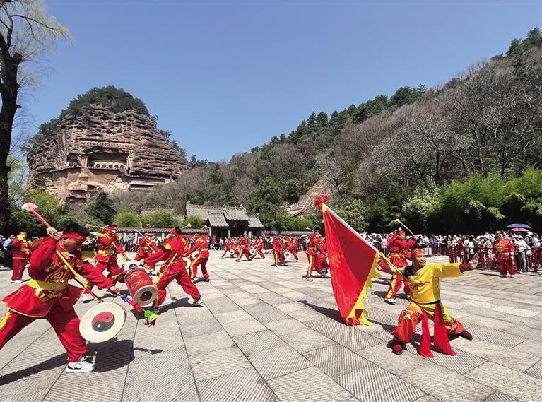 3月30日9時(shí),天水伏羲廟前人潮涌動(dòng),熱鬧非凡,來(lái)自蘭州的太平鼓隊(duì)以精彩絕倫的表演拉開(kāi)蘭州助力天水麻辣燙文旅推廣活動(dòng)大幕。