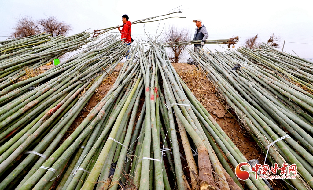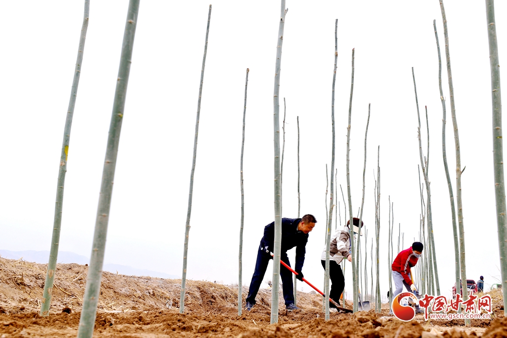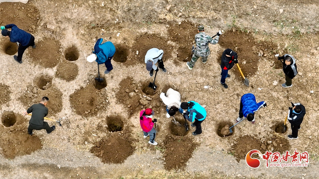 4月9日,甘肅省張掖市甘州區(qū)三閘鎮(zhèn)高寨村義務植樹基地上,千名當?shù)馗刹柯毠ず椭驹刚邆儞]鍬鏟土挖樹坑,掀起農(nóng)田防護林建設和防沙治沙春季植樹造林熱潮。