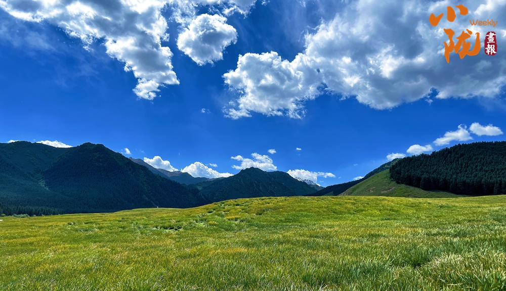 一片碧綠的草地,一望無際,像一片綠色的地毯鋪向遠方,伴著藍天白云和遠處森林、群山,構成了一幅美麗的風景畫。