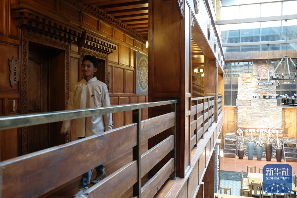 ↑ 扎尕那村一家民宿工作人員仁青從民宿走廊里走過(6月27日攝)。新華社記者 陳斌 攝