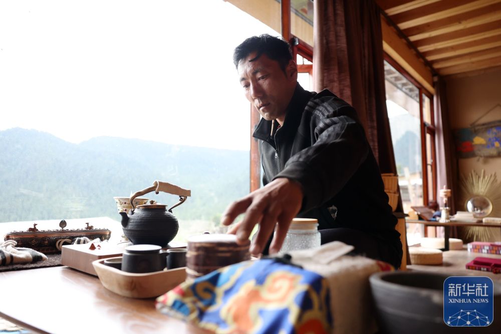 ↑ 扎尕那景區(qū)一家民宿經(jīng)營者卓瑪交在自家的民宿里整理茶臺(6月27日攝)。新華社記者 方欣 攝