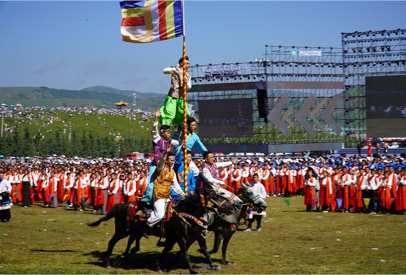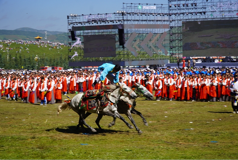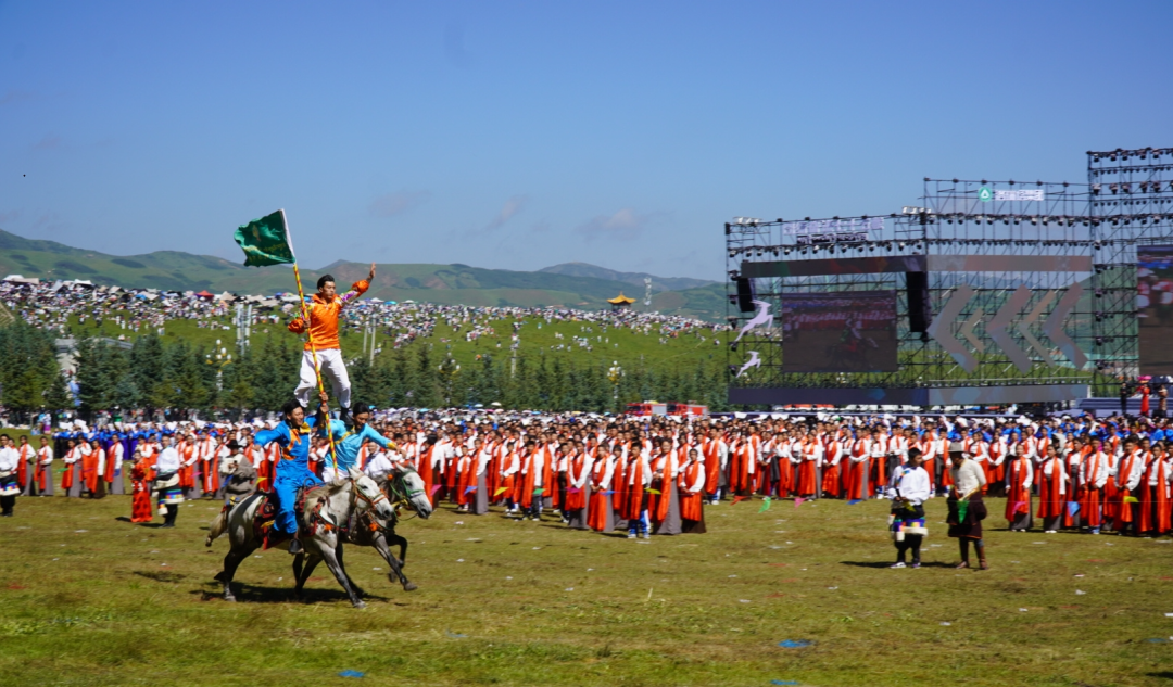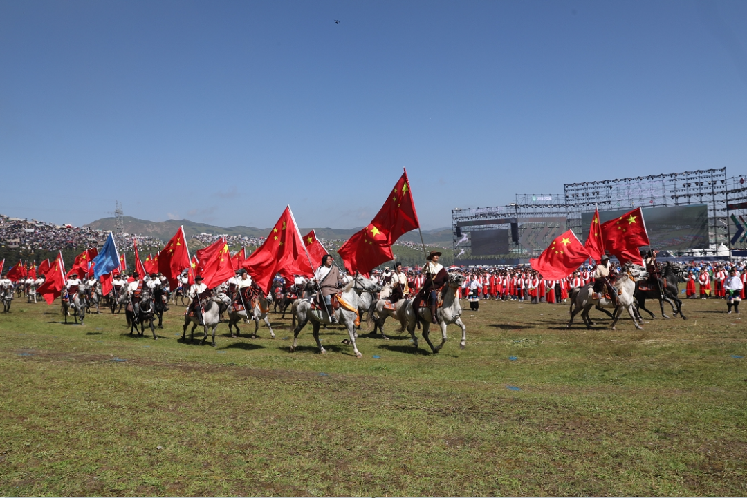 草原騎手乘著矯健的駿馬高舉著鮮艷的五星紅旗從主席臺前奔馳而過,讓在場的數萬觀眾贊嘆不已,呈現出一個絢麗多彩的甘南、和諧穩(wěn)定的甘南、朝氣蓬勃的甘南、包容開放的甘南、團結奮進的甘南。