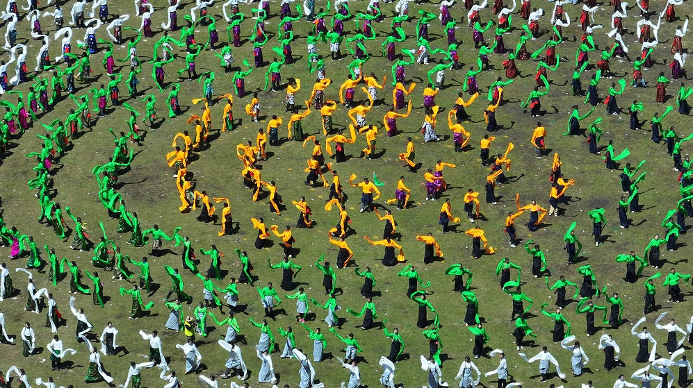 在歡快優(yōu)美的樂曲聲中,萬人鍋莊開始展演,動聽的樂曲、颯爽的舞姿、五彩的服裝,將甘南的生態(tài)之美、文化之美、民俗之美、和諧之美展示得淋漓盡致。圓圈形的鍋莊舞表達了甘南人民在中國共產黨領導下,各民族像石榴籽一樣緊緊擁抱在一起,為推動甘南高質量發(fā)展,畫出最大同心圓。