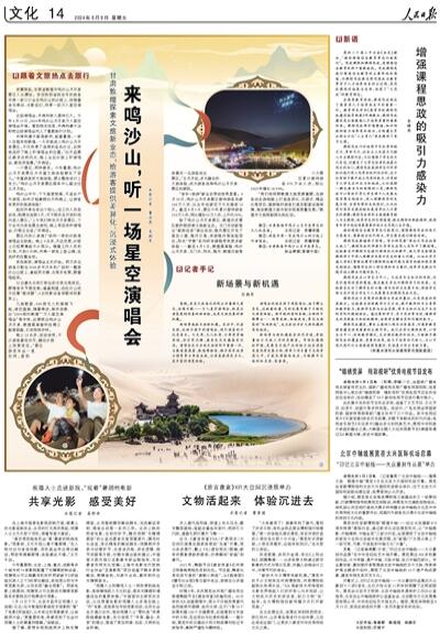 新場景造就文旅新機遇。采訪中,記者發(fā)現(xiàn),這場沙漠中的演唱會,吸引游客的不僅是音樂。燈光秀、無人機秀、沙屏秀穿插亮相,炫彩熒光棒、鹿角發(fā)光發(fā)箍備受歡迎。演唱會成為當(dāng)?shù)匚穆镁仃囍兄匾画h(huán),與敦煌莫高窟、敦煌博物館、雅丹國家地質(zhì)公園等景點串連成線,讓游客獲得更多元、更豐富的游覽體驗。
