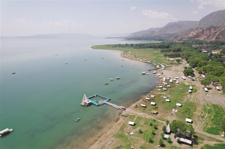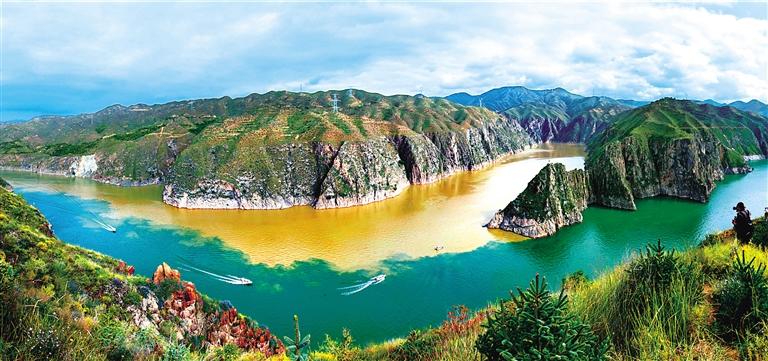 提及永靖劉家峽,第一反應(yīng)就是一個(gè)成語——“涇渭分明”。受上游降水影響,洮河河水比較渾濁,在與黃河交匯處劉家峽水庫的清波“相遇”時(shí),形成一清一黃兩股水流,河流呈“Y”字形交匯。交融卻不滲透,加上河中的石山,猶如兩條巨龍游戲于此,在當(dāng)?shù)剡@一景象也被稱為“二龍戲珠”。初秋時(shí)節(jié),來自全國各地的游客站在黃洮交匯觀景臺上,感受這份來自大自然的震撼與壯美,從高處遠(yuǎn)眺入河口,“黃河清,洮河黃”,可謂“涇渭分明”,景色極為壯觀。