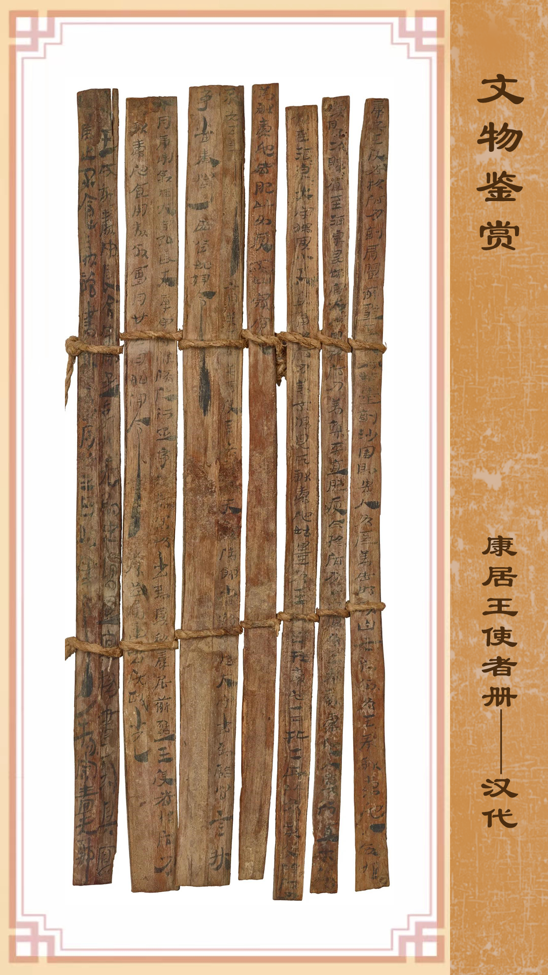 這份珍貴冊書記錄內(nèi)容為:永光五年(公元前39年),康居王使者和蘇薤王使者及貴人所獻(xiàn)的貢物在酒泉評估時發(fā)生了糾紛,朝廷責(zé)令敦煌郡和效谷縣進(jìn)行調(diào)查并將當(dāng)時的情況如實上報。該冊書的出土,不僅為研究當(dāng)時的行政和司法審判程序提供了第一手資料,更重要的是為研究漢朝與康居國的關(guān)系提供了原始資料,亦是今天的中亞各國研究本國古代歷史的重要資料,可補傳世史籍之闕載?,F(xiàn)藏甘肅簡牘博物館。