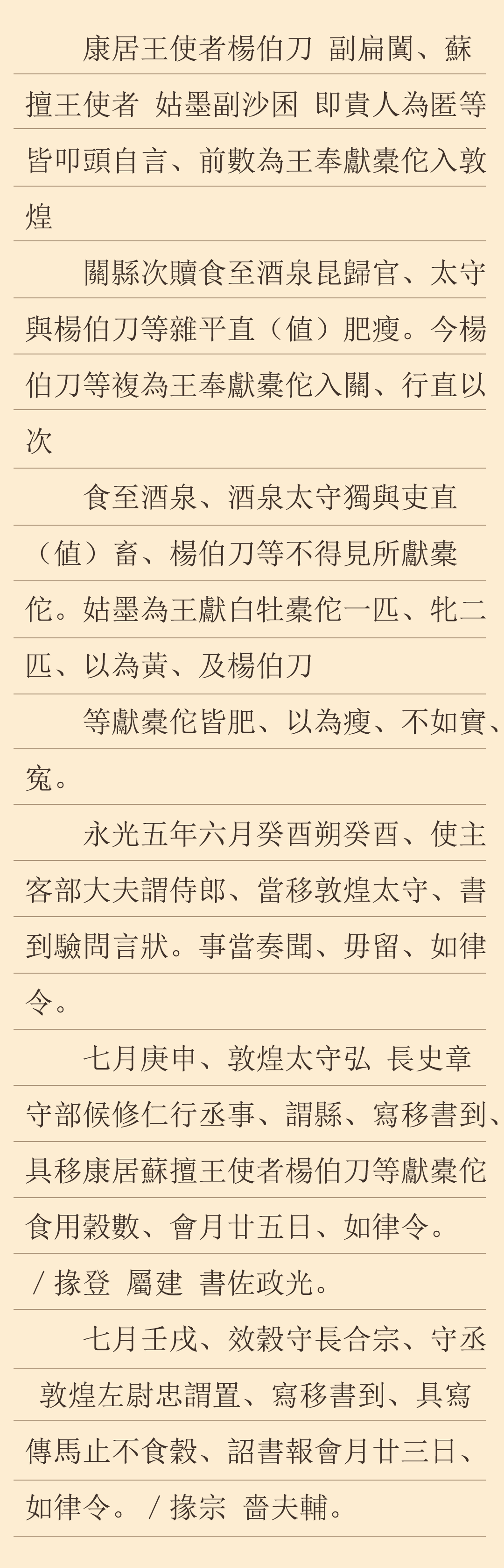 永光五年六月初一日(公元前39年7月21日),朝廷主管對外交往和蠻夷事務(wù)的使主客諫大夫行文敦煌,要求敦煌太守接到文件后對此進(jìn)行查詢并按時上報中央,不得留遲。七月庚申(9月6日),敦煌大守弘、長史章以及兼行丞事的守部候修仁聯(lián)署文件,下發(fā)效谷縣,要求縣廷接到文件后,將康居王使者路過縣境時為之提供的谷物數(shù)量,在七天之內(nèi)上報太守府。文書中有發(fā)文時掾、屬、書佐的具名。