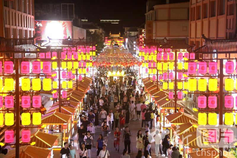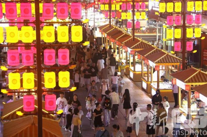 2024年8月17日,游客在甘肅省敦煌夜市游覽。進(jìn)入暑期以來,被譽為敦煌“夜景圖”的敦煌夜市日均客流量達(dá)3萬人次以上,游客在這里賞景游覽休閑,品嘗地方名優(yōu)小吃,選購敦煌特色文創(chuàng)產(chǎn)品,感受敦煌文化魅力,夜經(jīng)濟(jì)活力四射。中新社發(fā) 張曉亮 攝