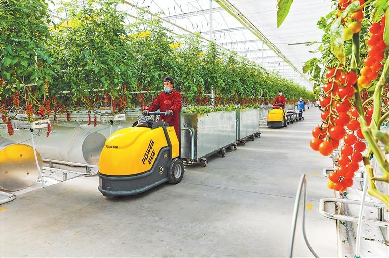 古浪越海農(nóng)業(yè)有限公司智能溫室內(nèi),務(wù)工人員運(yùn)送小番茄。 武威市融媒體中心供圖
