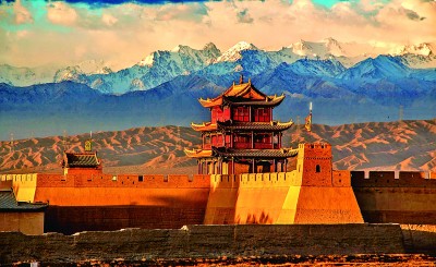 雄關(guān)六百載,長城越千年??唇癯瓯谥希斡P(guān)關(guān)城的朱色城樓與終年皚皚的祁連雪峰交相輝映,歷經(jīng)風(fēng)霜久而彌堅(jiān);峭壁之巔,長城第一墩矗立于此,腳下流淌的討賴河水澎湃不息;山脊之上,懸壁長城形似凌空倒掛,氣勢雄偉。