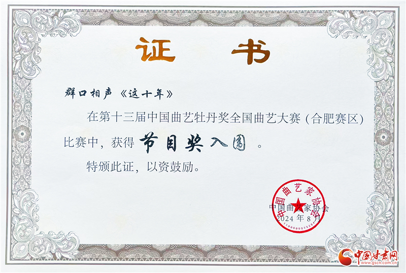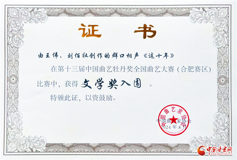 據了解,中國曲藝牡丹獎,是全國性曲藝藝術專業(yè)最高獎項。第十三屆中國曲藝牡丹獎全國曲藝大賽(合肥賽區(qū)),由中國文學藝術界聯合會、中國曲藝家協會、安徽省文化和旅游廳、安徽省文學藝術界聯合會、合肥市人民政府主辦,于8月18日至23日舉辦,是本屆牡丹獎四個分賽區(qū)中的最后一站,主要面向相聲、小品、“三書”類節(jié)目。中國曲協18家團體會員、中國曲協香港會員分會、中國曲協有關專業(yè)委員會、中直文藝院團以及省級文藝院團報送的節(jié)目參賽。期間,共收到480多個節(jié)目,48個節(jié)目入圍,《這十年》為甘肅地區(qū)唯一一件入圍作品。