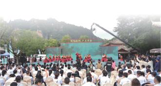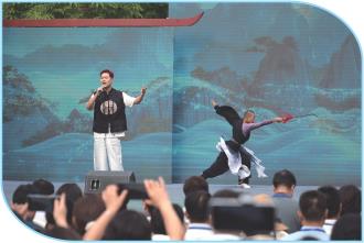 主詩會現(xiàn)場,氣勢恢弘的武術(shù)表演,精彩絕倫的拿手絕技,美輪美奐的崆峒山景,蕩氣回腸的武林唱響,組成一幅幅震天動地的美麗畫卷。伴著《少林,少林》《中國功夫》的歌聲,中岳武校功夫表演團數(shù)套行云流水的少林武術(shù),豪氣干云、笑逸蒼茫,一招一式古風(fēng)流存,展現(xiàn)出少林武者英雄豪杰的氣魄與豪邁,演繹了少林武魂的禪武精神。這些平常只能在電影或電視中才可以看到的少林武功,而今就在眼前,觀眾們紛紛報以熱烈掌聲。武與舞的“對話”,武與舞的“相遇”詮釋鐵血丹心、俠骨柔情。由平?jīng)鰫郯鹏嵛璧概嘤?xùn)中心帶來舞蹈《王母夜宴》,通過王母夜宴的歡樂場景,將西王母和周穆王相愛的神話故事深情講說,情濃處,千回百轉(zhuǎn),柔腸百結(jié)。一曲《刀劍如夢》穿越時空而來,歌手用獨特的嗓音,將這首歌演繹得淋漓盡致,將觀眾帶入了一個感性而深沉的氛圍,帶領(lǐng)我們回到了那個充滿江湖氣息的瑰麗世界。“滄海一聲笑,滔滔兩岸潮,浮沉隨浪只記今朝,蒼天笑,紛紛世上潮,誰負誰勝出天知曉滄海笑……”一曲《滄海一聲笑》,營造了一股濃濃的中國俠士逍遙風(fēng),旋律步步低落,先抑后揚,峰回路轉(zhuǎn),觀眾隨著音樂的意象一步步陷入蒼涼和寂寥中。隨著歌曲的高跌起伏,一個個精彩的片段定格為現(xiàn)場觀眾一張張手機影像。