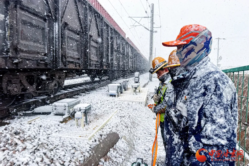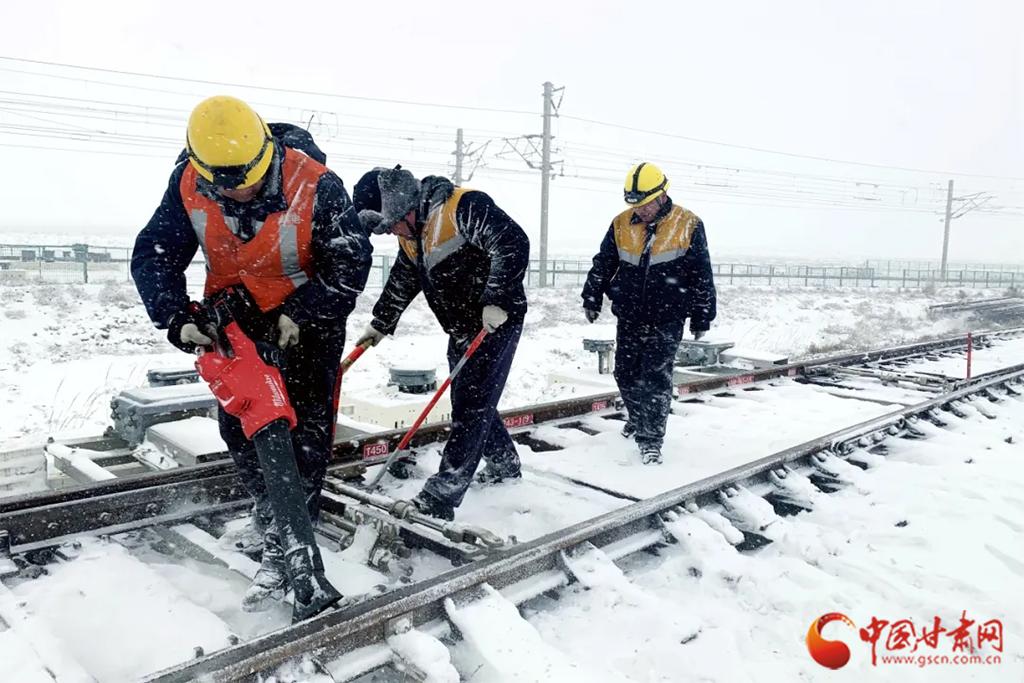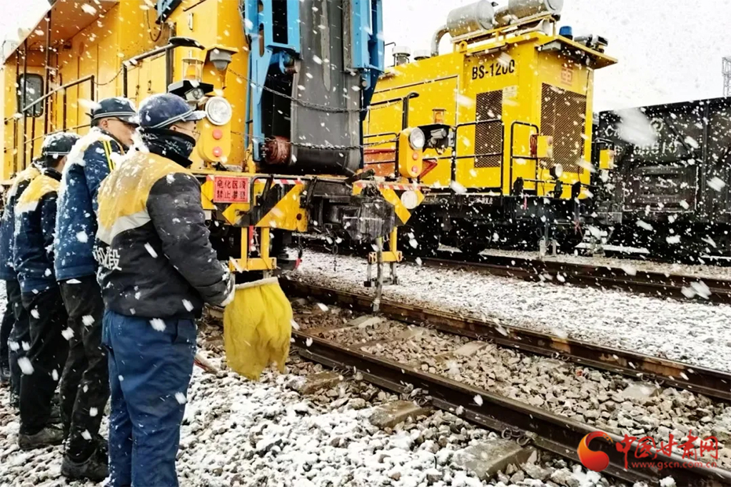 近日,受冷空氣影響,甘肅省古浪、山丹、永昌等地迎來(lái)降雪天氣。蘭州鐵路局各單位迅速啟動(dòng)應(yīng)急預(yù)案,上下聯(lián)動(dòng)、多措并舉迎戰(zhàn)風(fēng)雪,保障降雪天氣下運(yùn)輸安全暢通。(蘭州鐵路局供圖)