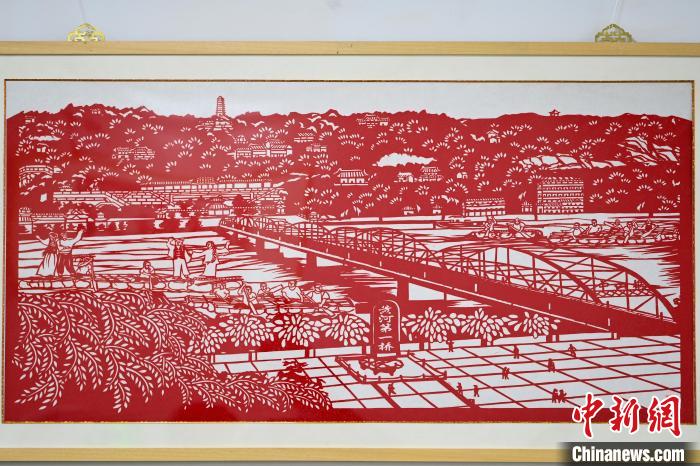 圖為展出以蘭州標(biāo)志性建筑中山橋?yàn)橹黝}的剪紙作品。中新社記者 九美旦增 攝