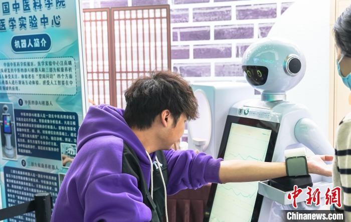 “灸童中醫(yī)藥文化周”活動(dòng)上觀眾體驗(yàn)與機(jī)器人互動(dòng)。中國(guó)科技館供圖