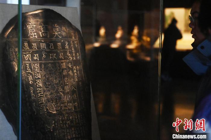 11月28日,甘肅省敦煌市,敦煌研究院敦煌石窟文物保護研究陳列中心,游人參觀《披沙揀金——敦煌研究院館藏文物擷英展》中的碑刻。該展由敦煌研究院主辦,2024年下半年煥新布展,展出了不同類型館藏文物,通過這些文物蘊含的豐富歷史信息,展現(xiàn)了敦煌文化的多元與包容,勾勒不同文明偕行共進的歷史脈絡。中新社記者 李亞龍 攝