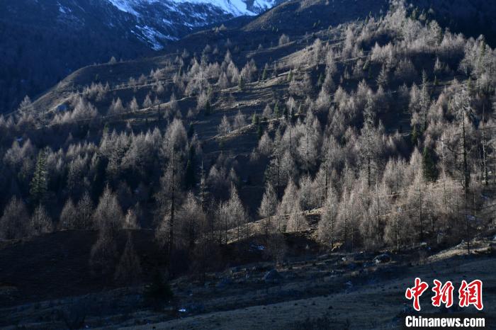 12月2日,四川省阿壩州小金縣四姑娘山雙橋溝植被夕陽(yáng)照射,形成一幅美麗畫卷。中新社記者 張浪 攝