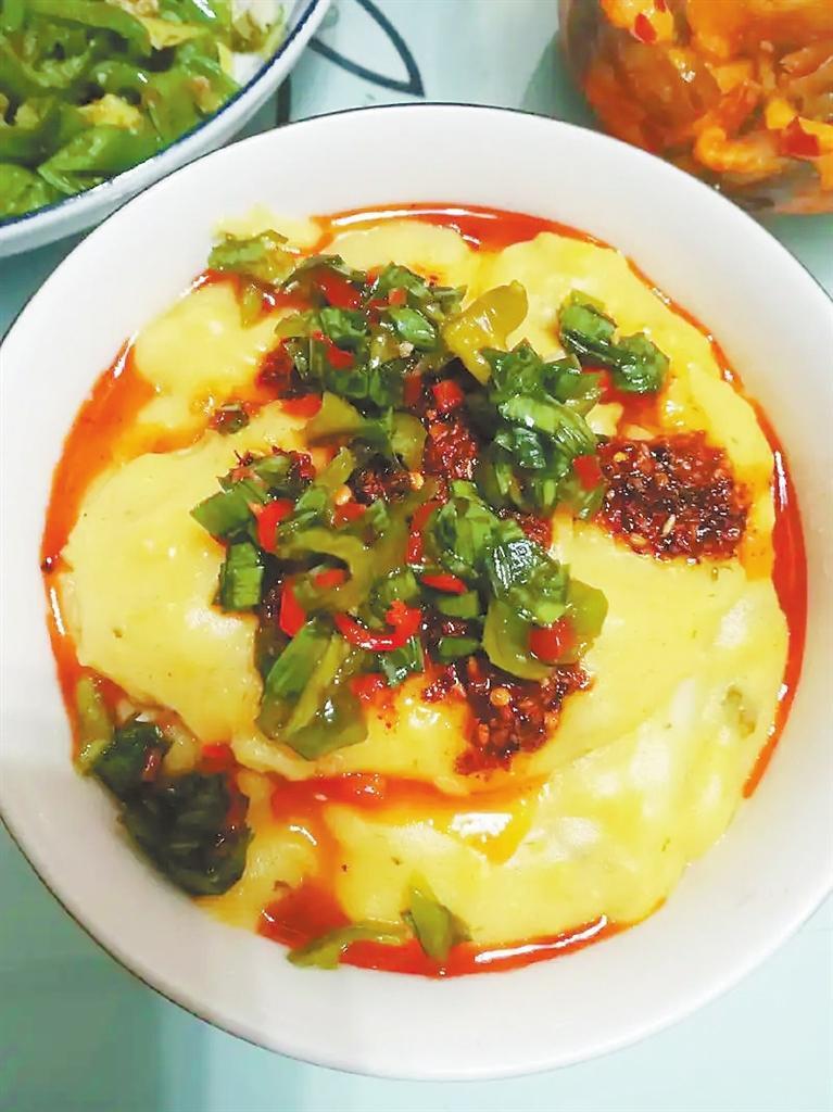 馓馓飯,要用新玉米面,今年新磨的,馓的飯才顏色亮,入口香。舊面就不行,咽口里,粗糙。燒半鍋水,水滾,翻白花。母親站鍋前,右手執(zhí)長(zhǎng)筷,在鍋里攪,左手抓一把面,手指慢慢蠕動(dòng),滑潤(rùn)的玉米面在指縫里,均勻地落下去,水上面一層細(xì)密的泡。一直攪,一直撒面,筷子不能停,停了便凝成面疙瘩。這時(shí)候,火要旺,火一小,就生了。最好是木柴火,火勢(shì)大,有后勁,茂盛的火苗才能伸著紅舌頭舔著黑鍋底。母親說(shuō),“人心要實(shí),火心要虛。”鍋面上,熱氣騰騰。白霧氣從廚房門涌出,像白馬,翻四蹄,跑進(jìn)了落著雪花的天上去。