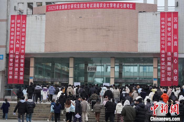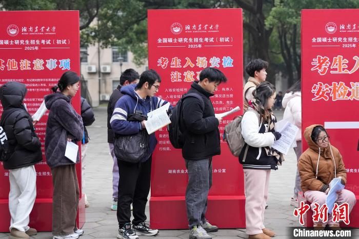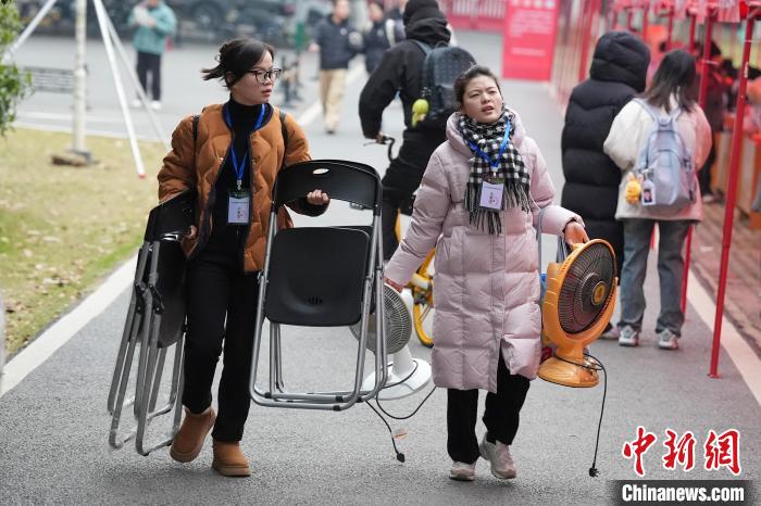 12月21日,2025年全國碩士研究生招生考試初試開考,眾多考生來到湖南農(nóng)業(yè)大學(xué)考點(diǎn)參考。據(jù)教育部數(shù)據(jù)顯示,2025年全國碩士研究生報名人數(shù)為388萬,相比去年下降50萬人,已是連續(xù)兩年報名人數(shù)下降。圖為志愿者將椅子與取暖設(shè)備送入考場。中新社記者 楊華峰 攝
