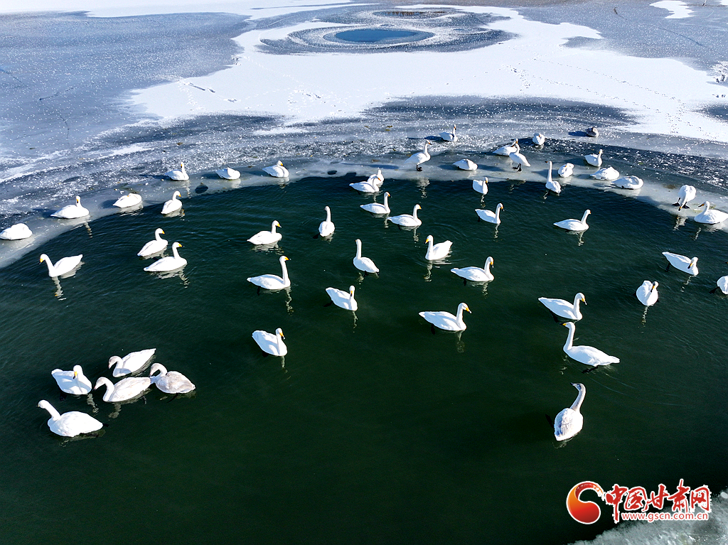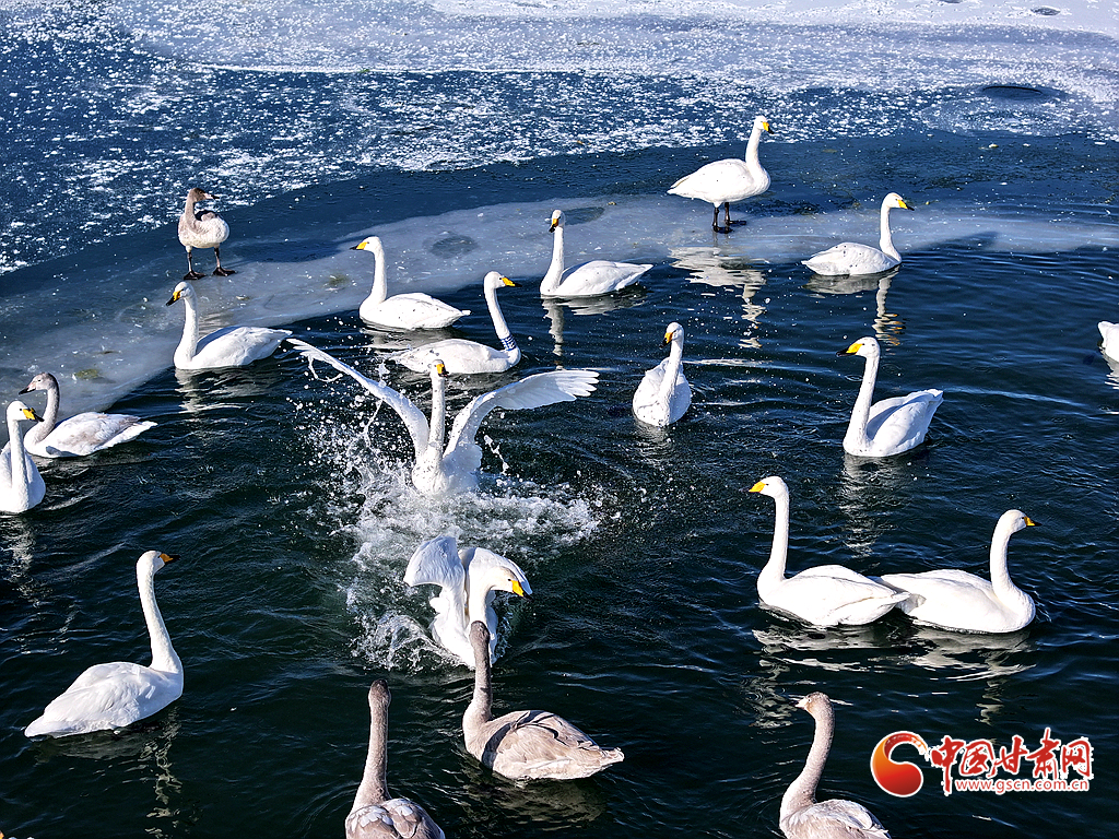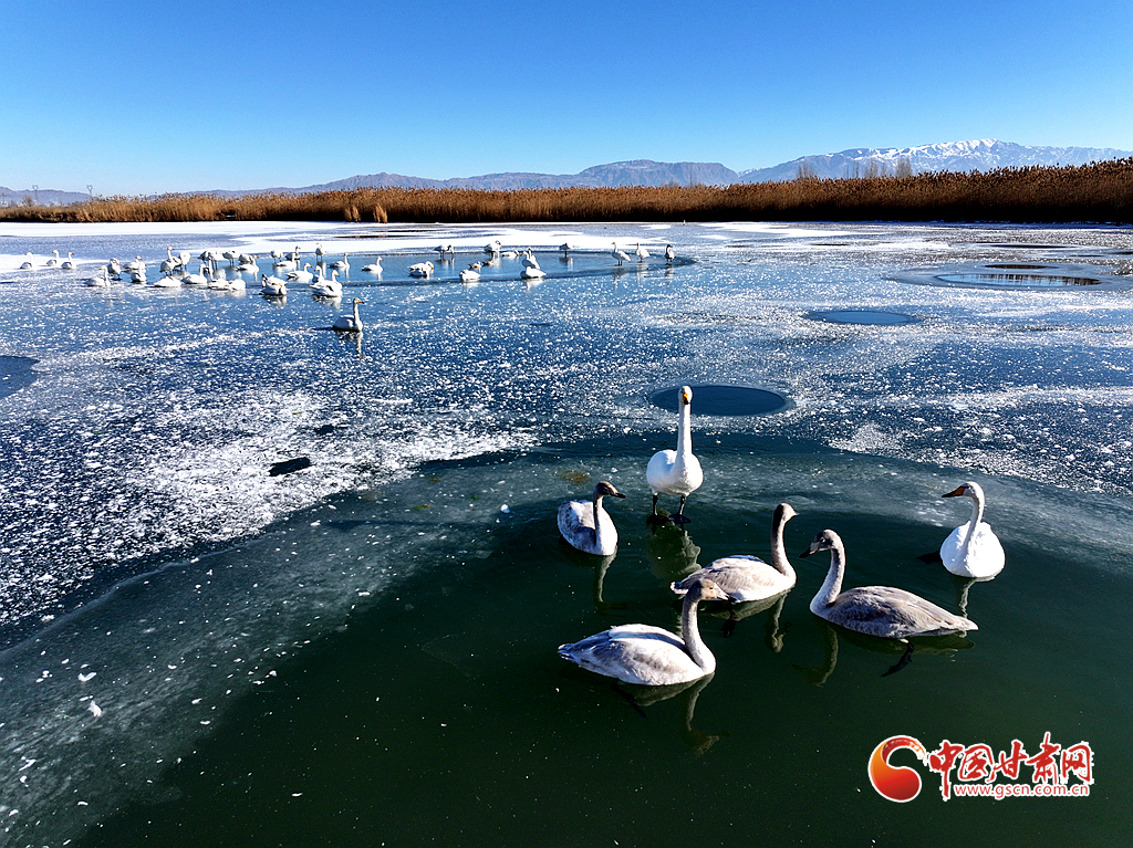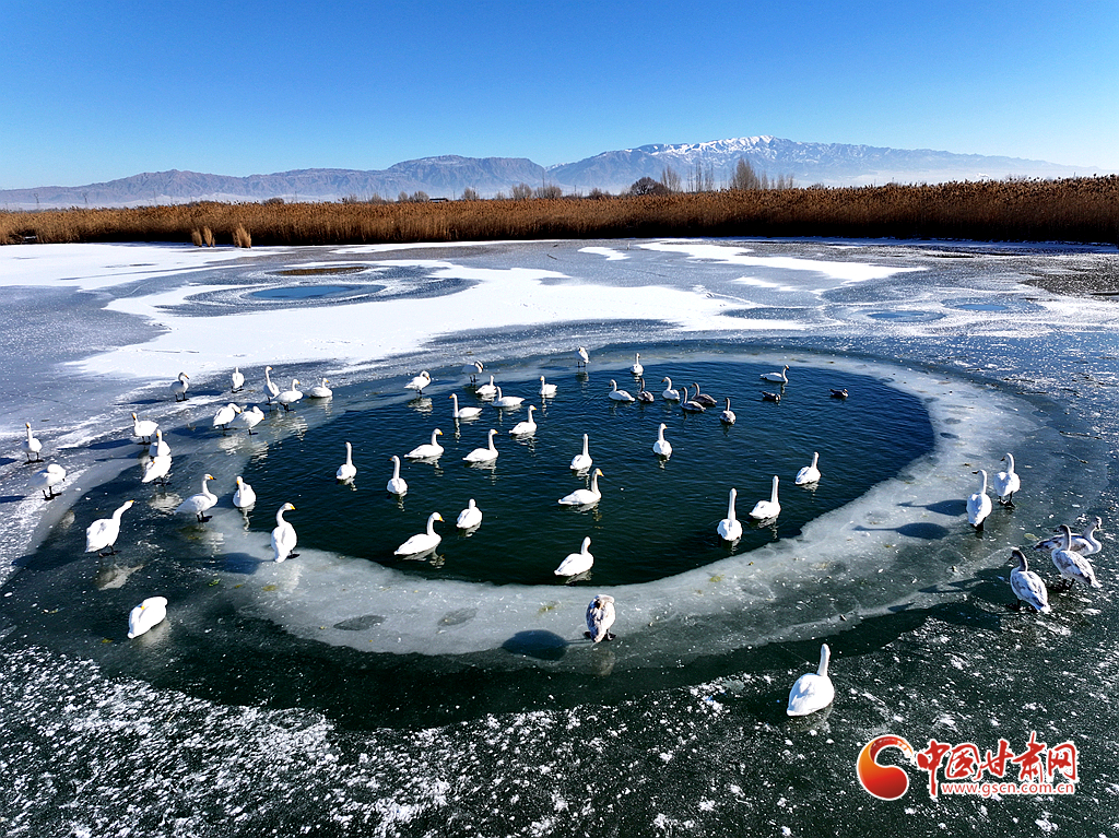 近日,在甘肅省張掖國(guó)家濕地公園,成群的越冬天鵝在冰封的湖面上悠然覓食、嬉戲,構(gòu)成了一幅動(dòng)人的生態(tài)畫(huà)卷,成為冬日里一道尤為引人注目的風(fēng)景線。