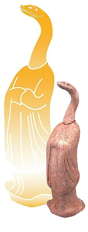 伏羲和女媧是中國(guó)神話傳說中的創(chuàng)世神靈,被視為人類文明的始祖。相傳他們均為蛇身人首的形象,象征著自然與人類的和諧統(tǒng)一。伏羲被認(rèn)為是發(fā)明八卦、結(jié)繩記事的智者,開啟了中華文明的智慧之門;而女媧則以其神力摶土造人,煉石補(bǔ)天,維護(hù)了天地的秩序。展覽中展出的高臺(tái)縣博物館館藏的一件魏晉時(shí)期的女媧圖彩繪壁畫磚。畫面繪女媧,人首蛇身,獸足,頭梳高髻,著交領(lǐng)紅裳,右手持月輪,月輪內(nèi)有蟾蜍,左手持規(guī),周圍繪云氣。同時(shí),還展出了一件高臺(tái)縣博物館館藏魏晉時(shí)期的伏羲女媧畫像磚,左側(cè)女媧,一手持矩、一手拿陰物,人首、蛇身、獸足、挽高髻、著交領(lǐng)長(zhǎng)衣,腹部繪月輪;右側(cè)伏羲,右手持規(guī),左手持日,內(nèi)有一金烏,周圍云氣環(huán)生,意在天界暢游。兩磚拼合形成陰陽交合圖,為墓葬中室頂部藻井彩繪圖像。畫像中人首蛇身的伏羲、女媧形象,濃縮著中國(guó)上古時(shí)代的蛇崇拜意識(shí)。我國(guó)古代有天圓地方之稱,伏羲執(zhí)規(guī)象征天,女媧執(zhí)矩象征地,反映了墓主人追隨升天的愿望,也期望其后代能夠繁衍生息。