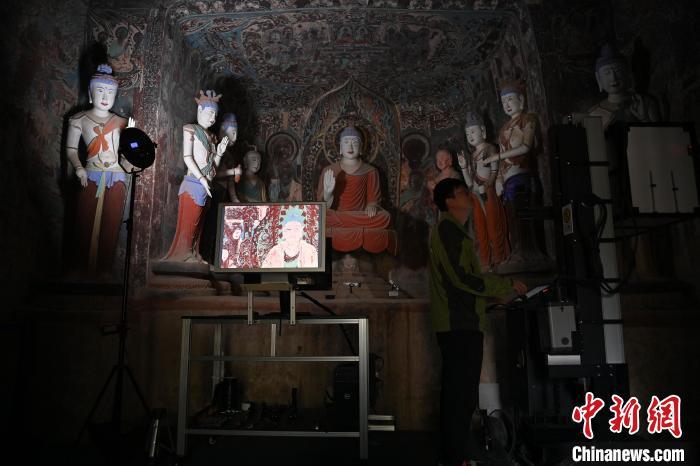 2024年6月5日,甘肅省敦煌市莫高窟內(nèi),敦煌研究院文物數(shù)字化研究所工作人員進行敦煌壁畫數(shù)字化采集工作?!≈行律缬浾?nbsp;李亞龍 攝
