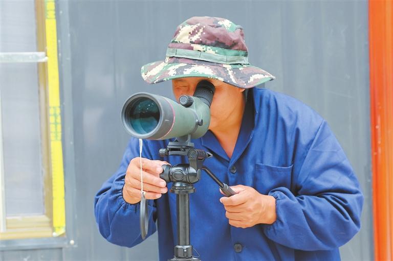宋治平通過單筒望遠(yuǎn)鏡觀察朱鹮。 新甘肅·甘肅日報(bào)記者 馮樂凱
