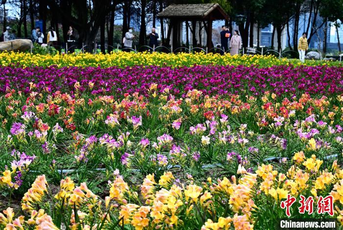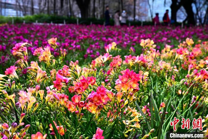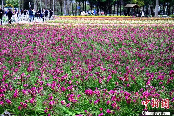 3月16日,游客在公園觀賞小蒼蘭。春日,福州花海公園魯冰花、小蒼蘭、油菜花等鮮花盛放,吸引了許多民眾前來漫步賞花,享受春天美好時(shí)光。中新社記者 張斌 攝