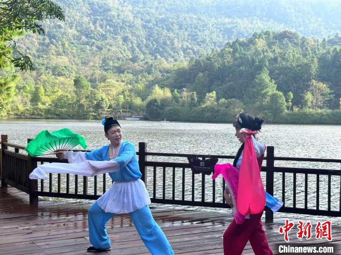 2024年11月,贛南采茶戲演員在江西贛州安遠(yuǎn)縣三百山景區(qū)表演采茶戲。(資料圖)安遠(yuǎn)縣采茶戲保護傳承中心 供圖