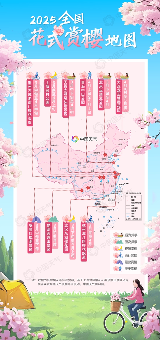 “櫻花紅陌上,柳葉綠池邊。”又是一年櫻花季!今年3月中下旬以來,我國大部經(jīng)歷了大回暖,催動(dòng)春花盛放,目前武漢、南京等地櫻花已進(jìn)入盛花期,北方多地櫻花也開始迎來觀賞期。中國天氣網(wǎng)特別推出2025全國花式賞櫻地圖,盤點(diǎn)十大賞櫻勝地最佳觀賞期和花式玩法,快來開啟你的賞櫻之旅吧。