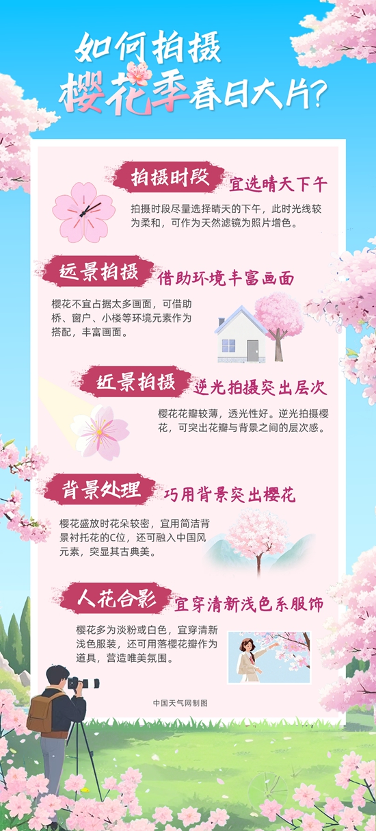 櫻花盛放燦若云霞,但花季卻十分短暫,拍照是留住櫻花之美的絕佳方法之一。如何捕捉櫻花的層次感?人花合影如何營造浪漫氛圍感?中國天氣網(wǎng)從景別、構(gòu)圖、拍攝時(shí)段等方面總結(jié)了拍攝小貼士,助你拍出絕美春日大片。