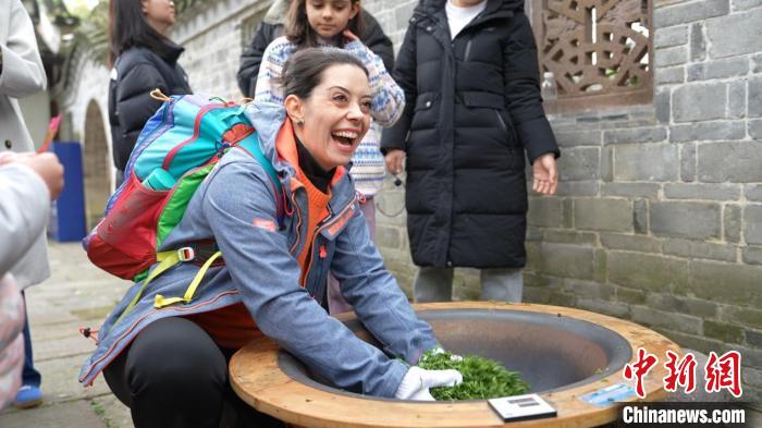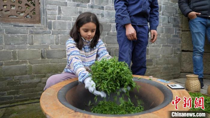 3月30日,來(lái)自巴西的游客奧莉薇體驗(yàn)炒茶。 朱海升 攝