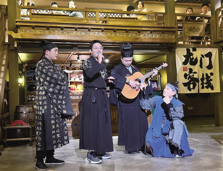 “諸位小友近來(lái)可好?”“好!”在街區(qū),NPC們與游客的互動(dòng)成為一大亮點(diǎn)。為了讓游客更好地沉浸其中,街區(qū)里的“蘭裳閣”專門提供服裝出租和妝造設(shè)計(jì)服務(wù)。游客們?cè)谶@里換上漢服、做好造型,“穿越”成古人與NPC們共同沉浸在這場(chǎng)歷史旅行中。張偉彥在“龍門客棧”工作快半年了,飾演店小二馬一刀。他對(duì)角色有著自己的理解:“導(dǎo)演讓我演店小二,大家印象里店小二都是機(jī)靈、腿腳快的。但我演的這個(gè)店小二帶著江湖氣息,他藏在龍門客棧,其實(shí)是個(gè)刀客,在這里打工是為了打探消息,畢竟龍門客??墒墙⒌木奂?。”記者走在街區(qū),時(shí)不時(shí)就能看到他拿著草帽,熱情地招呼游客玩接帽子游戲。遇到靦腆不敢嘗試的游客,他也會(huì)不斷鼓勵(lì),有時(shí)候碰上外國(guó)游客,他還隨口說(shuō)幾句英語(yǔ)與其互動(dòng)。
