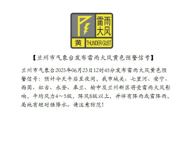 蘭州市氣象臺2025年06月23日12時45分發(fā)布雷雨大風黃色預警信號:預計今天午后至夜間,我市城關、七里河、安寧、西固、紅古、永登、皋蘭、榆中及蘭州新區(qū)將受雷雨大風影響,平均風力4~5級,陣風8級以上,并伴有陣雨或雷陣雨,局地有短時強降水。請注意防范!