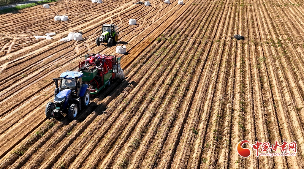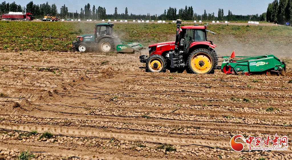 8月14日,祁連山下的張掖市高臺縣新壩鎮(zhèn)馬鈴薯種植基地一片繁忙。收獲機(jī)在田間穿梭,碩大的馬鈴薯破土而出,工人們正加緊進(jìn)行撿拾、分揀和裝車。
