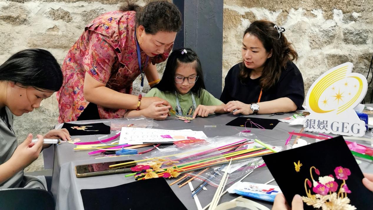 (唐彩萍在澳門(mén)教小朋友制作麥稈畫(huà))