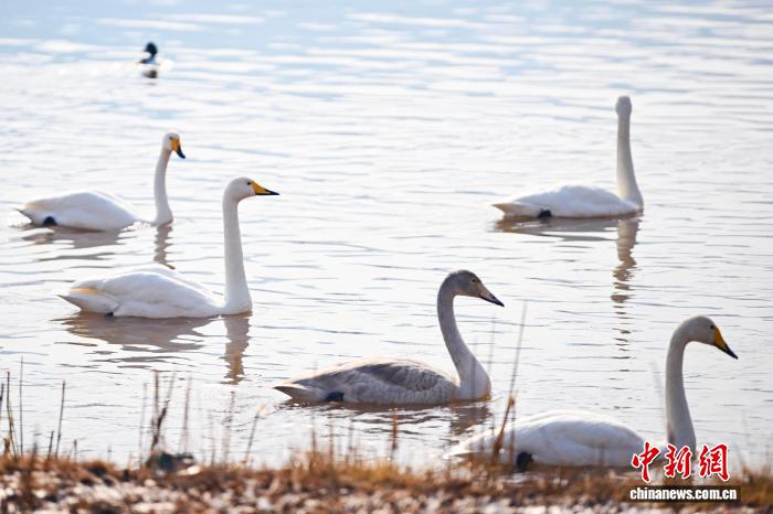 12月9日,在位于甘肅省蘭州市西固區(qū)達(dá)川鎮(zhèn)三河口濕地,從西伯利亞而來的白天鵝嬉戲。據(jù)悉,該地屬于黃河、湟水、大通河三河交匯之處,生態(tài)環(huán)境良好,擁有1200畝蘆葦蕩。近年來,該地吸引越來越多來自西伯利亞的白天鵝選擇在此停歇棲息。中新社記者 李亞龍 攝