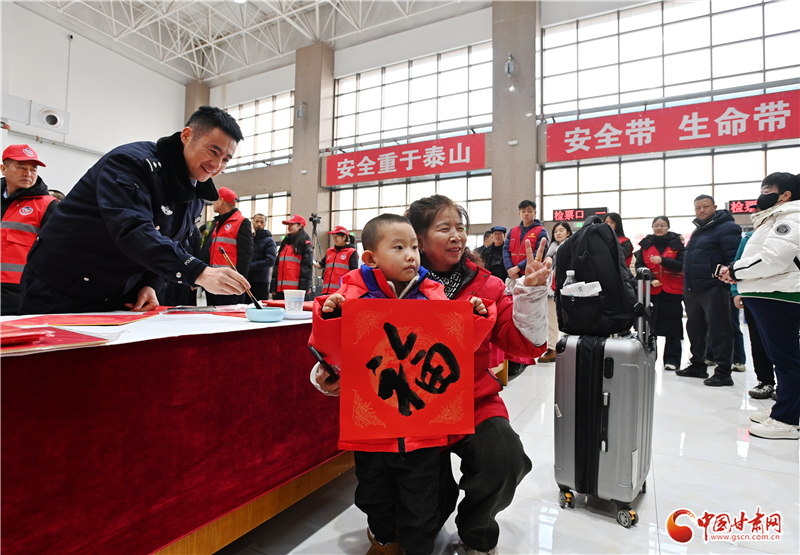 活動現(xiàn)場設(shè)置了“平安送福”“登車叮囑”等宣傳服務(wù)項目,現(xiàn)場為旅客、駕駛?cè)速浰痛郝?lián)、福字,提醒春運文明安全出行。
