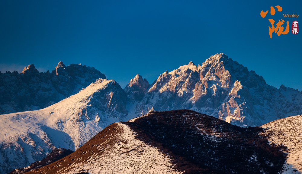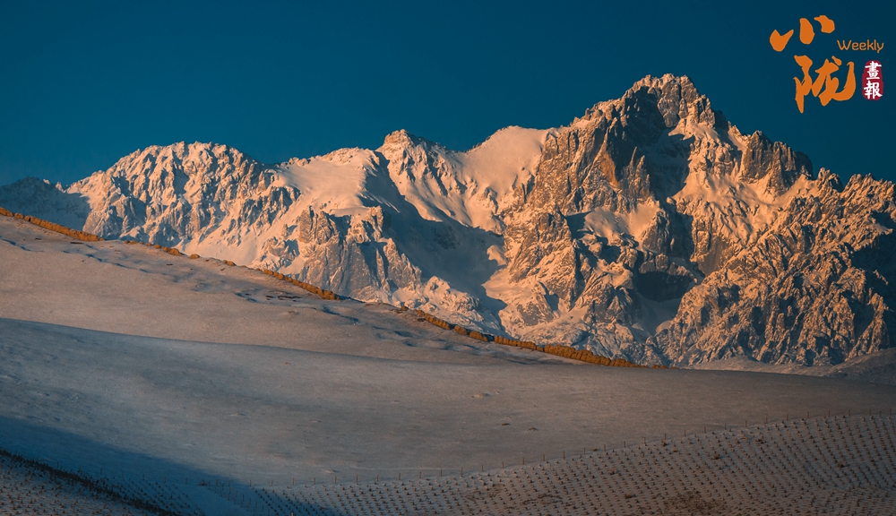 霞光沿著陡峭的山體徐徐蔓延,把寒光凜凜的積雪暈染成溫厚的琥珀色澤。天穹是沉靜的湛藍(lán),雪山則如一件精心鍛造的鎏金藝術(shù)品懸于其間——山腰以下浸入蒼茫暮色,峰巔之上仍燃燒著最后的輝煌。