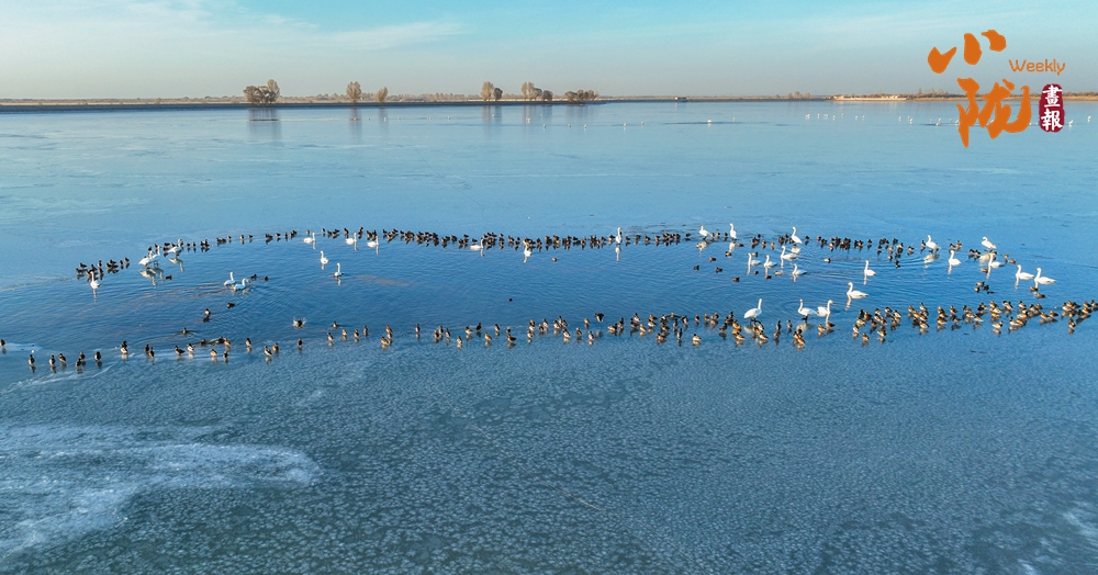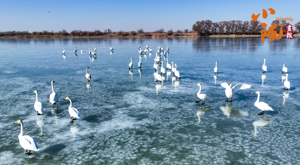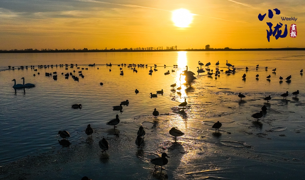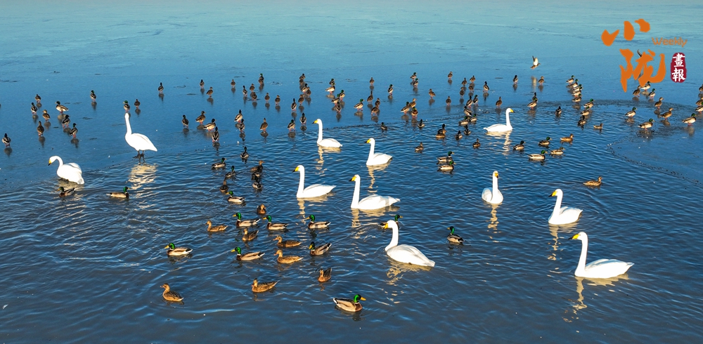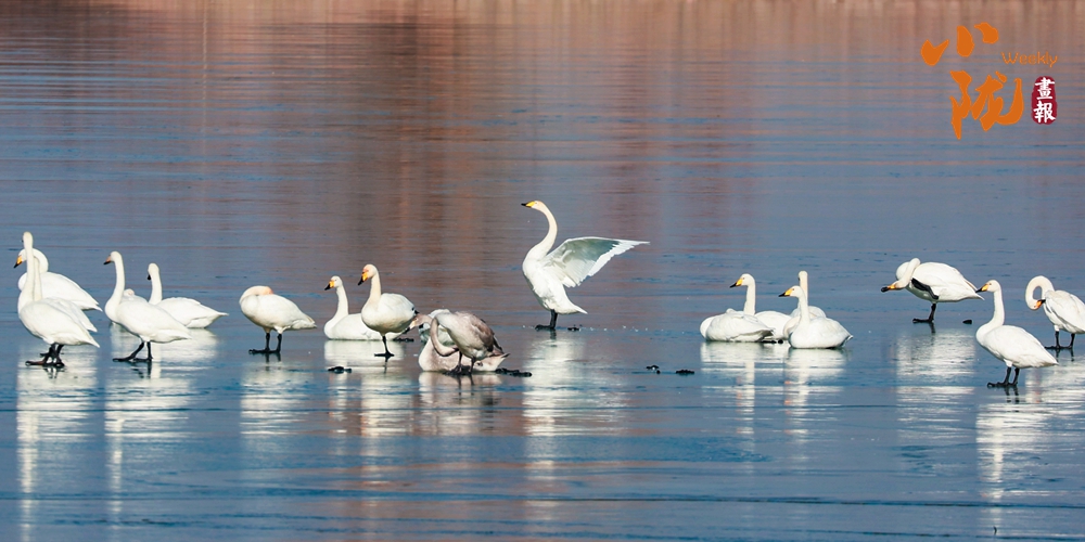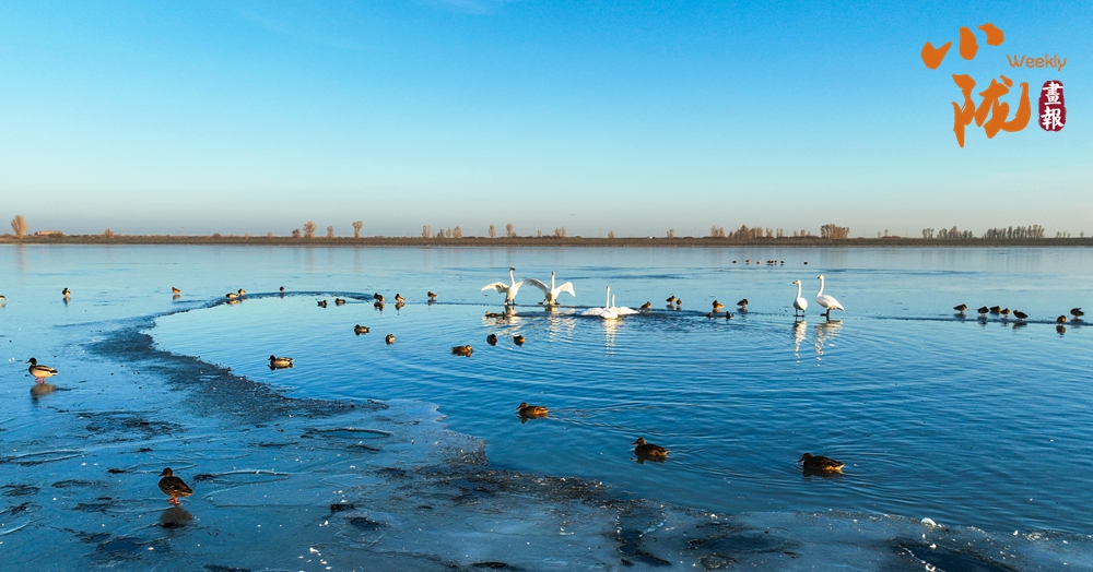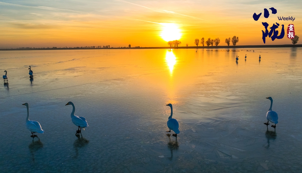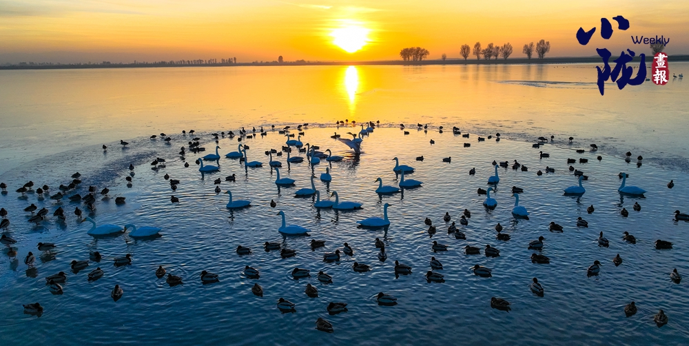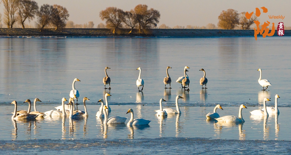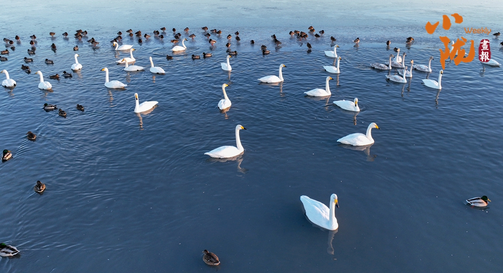 陽光斜照,萬物生暖。水面上,成群的白天鵝不緊不慢地游著,雪白的身影倒映水中,隨著微波輕輕蕩漾,像是一幅流動(dòng)的水墨畫,素雅而安寧。
